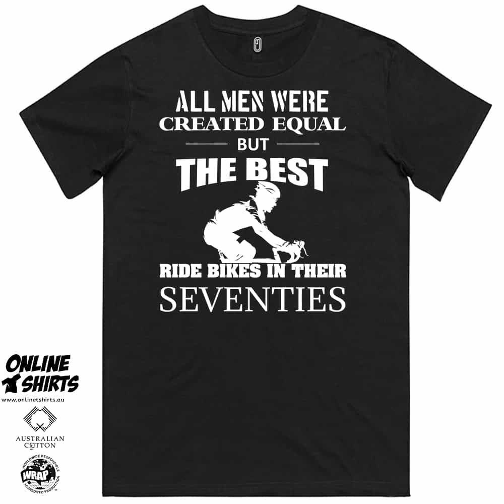 The All Men Were Created Equal But The Best Ride Bikes in Their Seventies T Shirt is a Premium Quality Fashion T Shirt produced using Australian Cotton